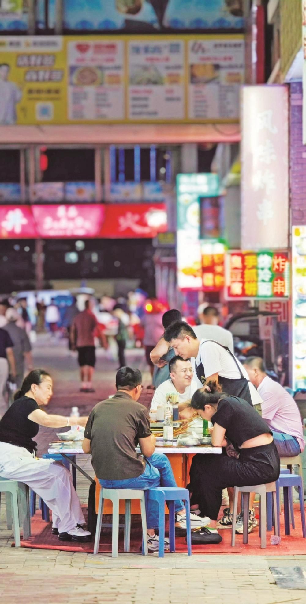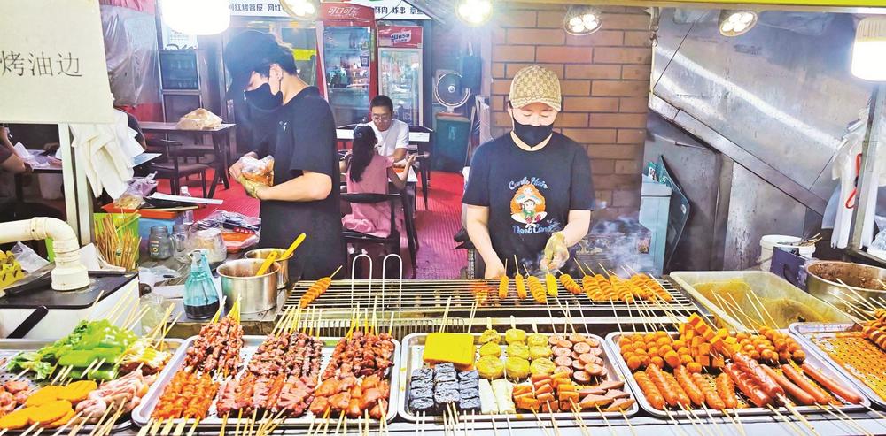 炭火上的羊肉串嗞嗞作響,油脂滴落,迸出金色火花,散發(fā)出誘人的香氣??腿藝谒芰闲∽琅?,手里拿著冰鎮(zhèn)啤酒,碰杯傳出清脆的響聲……這里沒(méi)有高檔餐廳的拘謹(jǐn),只有朋友相聚的歡樂(lè)和大口吃肉的暢快。大學(xué)生徐瑞虹放暑假后,經(jīng)常和朋友來(lái)夜市消暑。“我們幾個(gè)沒(méi)事就來(lái)萬(wàn)達(dá)金街轉(zhuǎn)一轉(zhuǎn),天太熱了,待在家里也悶,而且夜市里的這些小吃我們都比較喜歡,沒(méi)事幾個(gè)人喝幾瓶啤酒,聊一聊天,感覺(jué)還是很愜意的?!睂?duì)于年輕人來(lái)說(shuō),夜市不僅是美食的聚集地,更是釋放壓力、享受生活的好去處。在這里,他們可以暫時(shí)拋開(kāi)煩惱,盡情享受美食帶來(lái)的快樂(lè)。