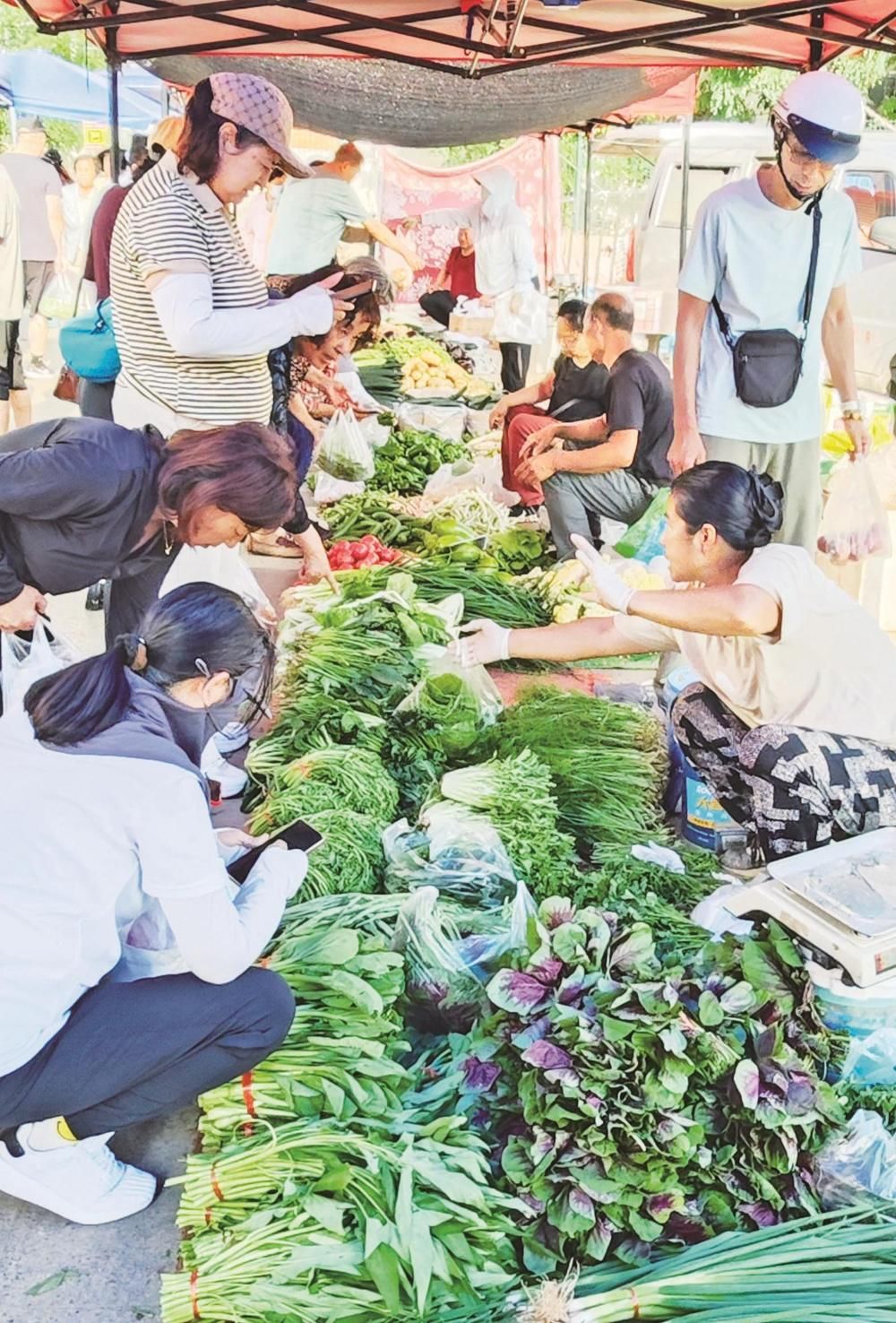 夏日的早市里,菜攤攤主牛麗梅就已經(jīng)擺放好新鮮的蔬菜,泡沫箱里的黃瓜頂著嫩黃的花,筐里的西紅柿還帶著露珠,“這些菜都是半夜起來(lái)從地里現(xiàn)摘的,你看看這黃瓜頂花帶刺的,多新鮮。我已經(jīng)在這個(gè)早市擺了十來(lái)年攤了,人們還是很認(rèn)可我家的蔬菜,就是累點(diǎn)也覺(jué)得挺高興的?!彼裏崆榈卣泻糁皝?lái)買菜的市民,過(guò)秤、算賬,干脆利落,一看就有著豐富的賣菜經(jīng)驗(yàn)。