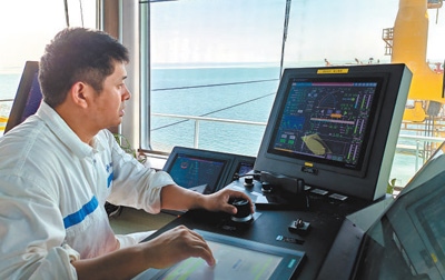 工作人員在“新海鯊”輪駕駛艙操作設備。本報記者 管克江攝
