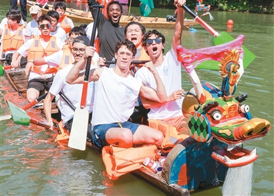 去年,我參加了由杭州余杭區(qū)五常街道組織的龍舟體驗營,親身感受競渡帶來的“速度與激情”。我和同校好友組成隊伍,伴著耳邊觀眾的熱情歡呼揮槳出發(fā),濺起的水花在河道綻放。握槳、入水、拉水、出水、回槳……隨著龍舟劃至終點,我們揮舞校旗、舉槳歡呼。在龍舟運動中,我感受到了奮斗和團(tuán)結(jié)的力量——不同膚色的人們在同一條水道上并肩奮進(jìn),這不正是“同舟共濟(jì)”的東方智慧嗎!