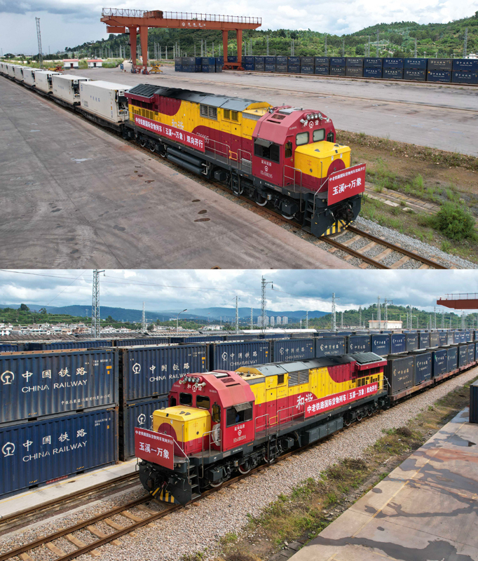 當日,中老鐵路國際貨物列車(玉溪—萬象)實現雙向開行。中老鐵路自2021年12月開通以來,截至今年7月底,運輸貨物超6450萬噸,其中跨境貨物突破1490萬噸。