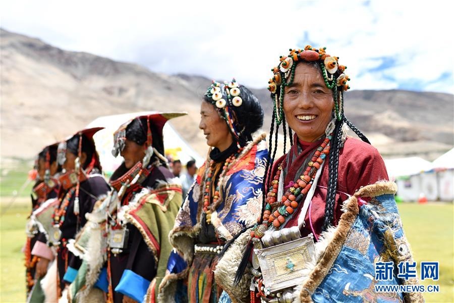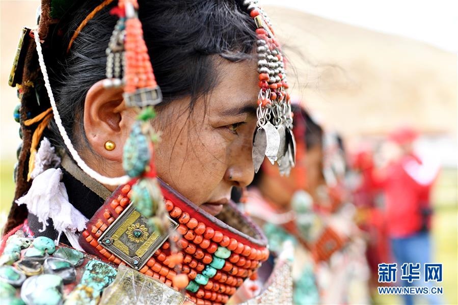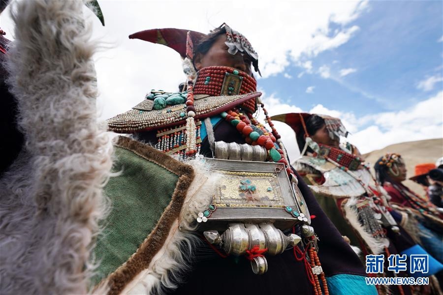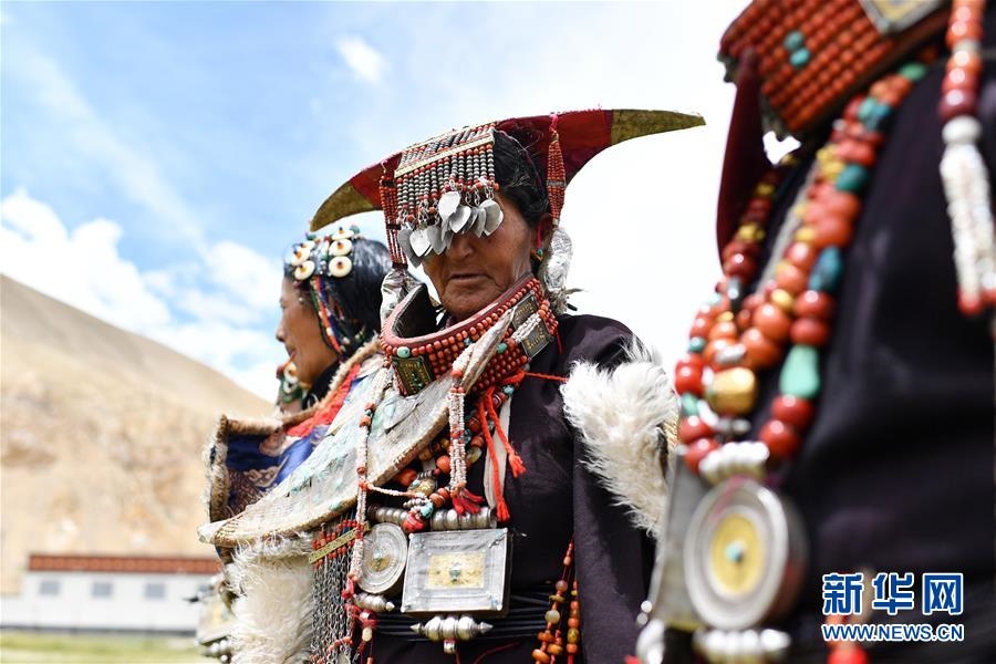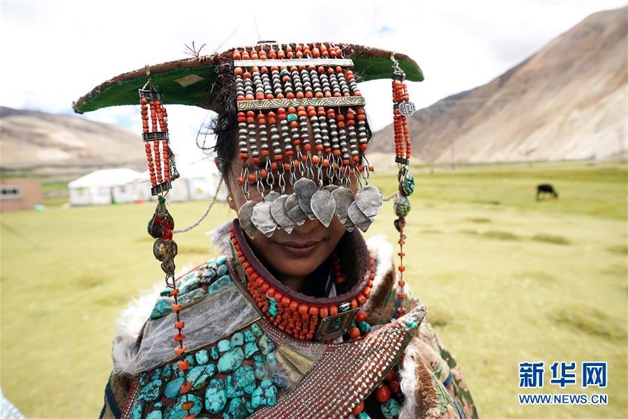 這是7月28日拍攝的身著普蘭服飾的普蘭縣科迦村村民。在西藏阿里地區(qū)普蘭縣,至今保留著獨特的藏族服飾——普蘭服飾。據(jù)了解,普蘭服飾已有1000多年的歷史,其中最精美、最獨特的是婦女的“孔雀”服飾,一套重達(dá)20多公斤,裝飾有黃金、白銀、蜜蠟、珊瑚、綠松石等,堪稱“穿在身上的千年歷史”。新華社記者詹彥攝
