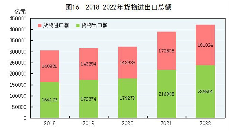 全年貨物進(jìn)出口總額420678億元,比上年增長(zhǎng)7.7%。其中,出口239654億元,增長(zhǎng)10.5%;進(jìn)口181024億元,增長(zhǎng)4.3%。貨物進(jìn)出口順差58630億元,比上年增加15330億元。對(duì)“一帶一路”[40]沿線國(guó)家進(jìn)出口總額138339億元,比上年增長(zhǎng)19.4%。其中,出口78877億元,增長(zhǎng)20.0%;進(jìn)口59461億元,增長(zhǎng)18.7%。對(duì)《區(qū)域全面經(jīng)濟(jì)伙伴關(guān)系協(xié)定》(RCEP)其他成員國(guó)[41]進(jìn)出口額129499億元,比上年增長(zhǎng)7.5%。