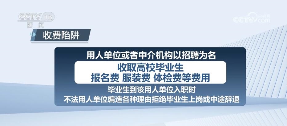 用人單位或者中介機構(gòu)以招聘為名,收取高校畢業(yè)生報名費、服裝費、體檢費等費用。畢業(yè)生到該用人單位入職時,不法用人單位編造各種理由拒絕畢業(yè)生上崗或中途辭退。