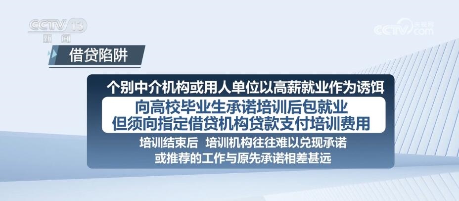 個別中介機構(gòu)或用人單位以高薪就業(yè)作為誘餌,向高校畢業(yè)生承諾培訓后包就業(yè),但須向指定借貸機構(gòu)貸款支付培訓費用。培訓結(jié)束后,培訓機構(gòu)往往難以兌現(xiàn)承諾,或推薦的工作與原先承諾相差甚遠。