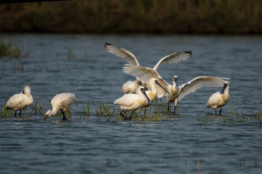 4月8日,黑臉琵鷺在福建省閩江河口濕地停歇。新華社記者 梅永存 攝