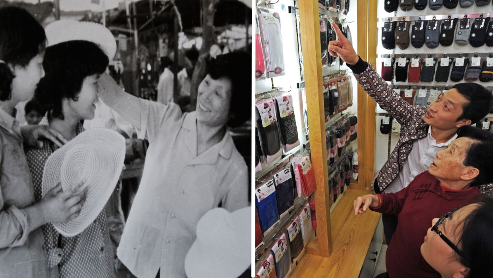 ↑拼版照片,左圖為:義烏小商品市場第一代經營戶馮愛倩(右)在向顧客推銷遮陽帽(攝于上個世紀80年代);右圖為:2018年10月25日,78歲的馮愛倩(中)在傾聽她的孫子、義烏國際商貿城經營戶楊帆(上)介紹他自產自銷的新款襪子。楊帆大學畢業(yè)后當上了父親創(chuàng)辦的襪業(yè)公司的總經理。