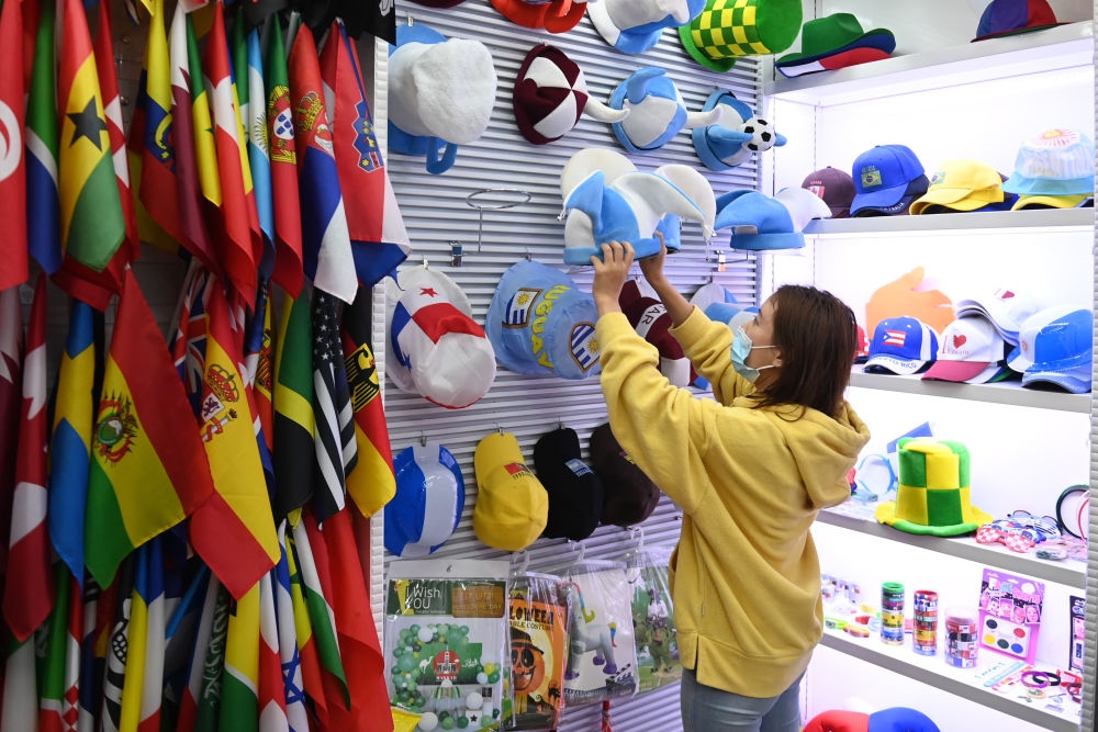↑2022年11月17日在義烏國際商貿城,一家獲得官方授權的商戶在展示2022卡塔爾世界杯參賽國家旗幟與周邊產品。