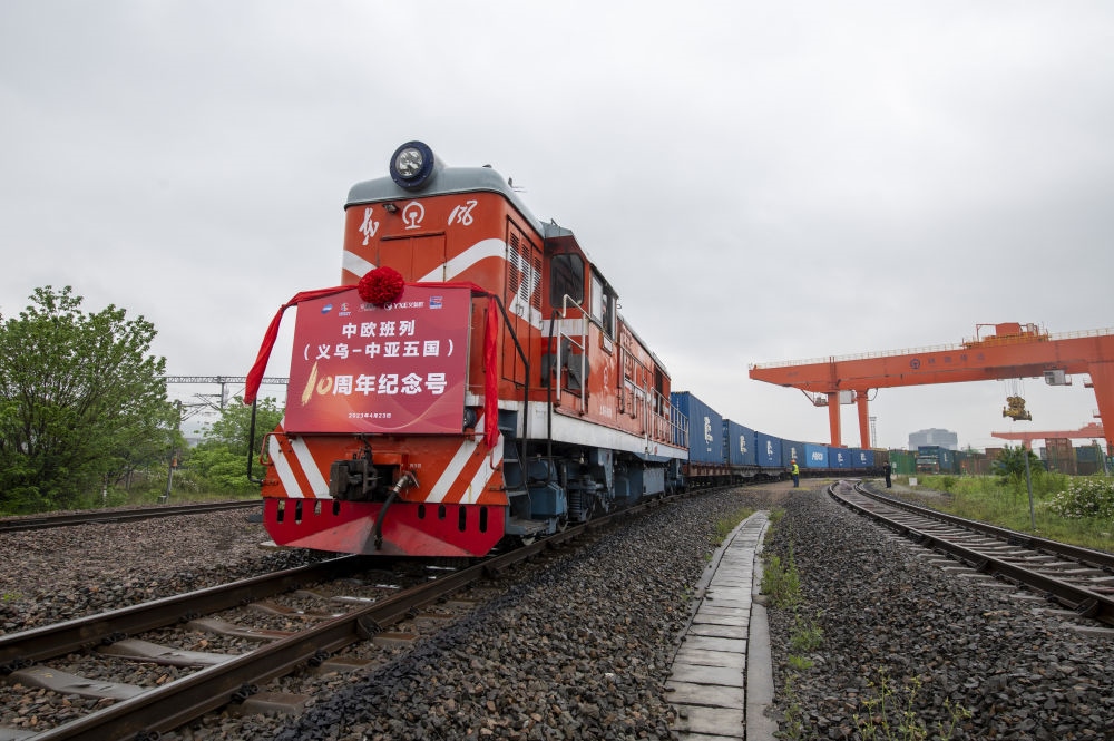 ↑2023年4月23日在義烏西站拍攝的“義烏-中亞五國10周年紀念號”中歐班列。