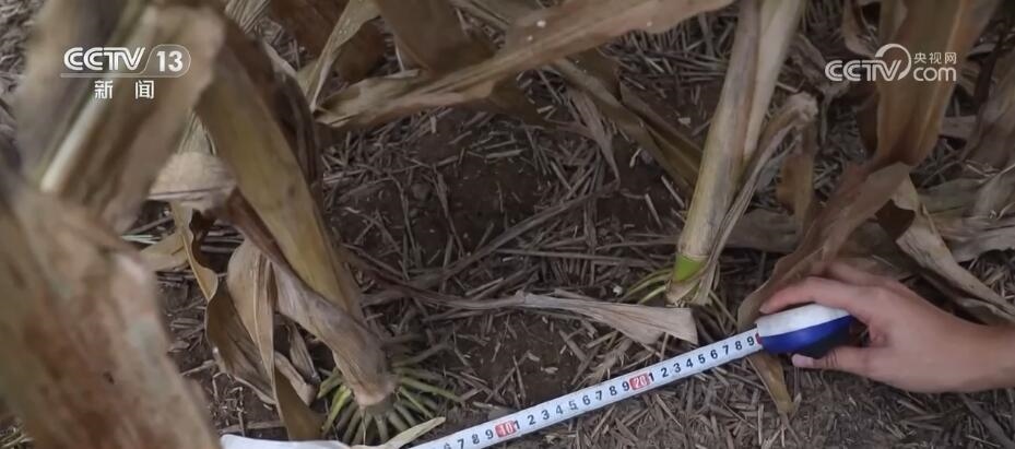 我們扒開田里的玉米看一下,可以看到玉米色澤金黃,而且顆粒飽滿,這說明玉米的品質(zhì)是非常好的。除此之外,這個(gè)玉米品種還有一個(gè)特點(diǎn)就是耐密。一般的玉米株距在28—30cm,我們拿尺子測(cè)量一下,玉米株距大約在24cm,相對(duì)一般玉米比較小,這樣每畝地種植的玉米株數(shù)更多,產(chǎn)量也就相對(duì)較高。