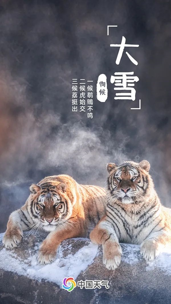 大雪分為三候:一候鹖鴠不鳴,因天氣寒冷,寒號(hào)鳥(niǎo)都不再鳴叫了;二候虎始交,由于此時(shí)是陰氣最盛的時(shí)期,且陽(yáng)氣已有所萌動(dòng),老虎開(kāi)始有求偶行為;三候荔挺出,“荔挺”是蘭草的一種,它們會(huì)在感到陽(yáng)氣時(shí)抽出新芽。