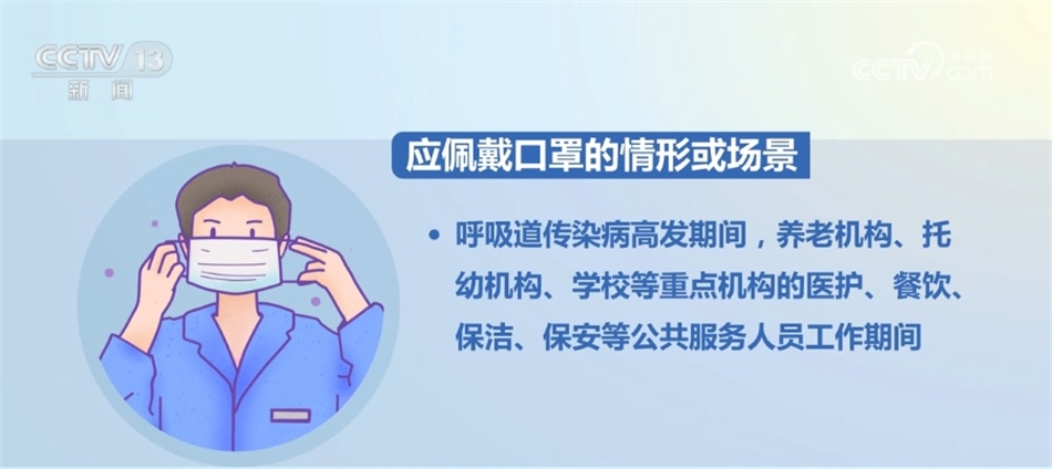 《指引》明確,應(yīng)佩戴口罩的情形或場景包括:新冠病毒感染、流感、肺炎支原體感染、呼吸道合胞病毒感染等呼吸道傳染病感染者前往室內(nèi)公共場所或與他人近距離接觸時(shí)。出現(xiàn)發(fā)熱、咳嗽、流涕、咽痛、肌肉酸痛、乏力等呼吸道傳染病癥狀者前往室內(nèi)公共場所或與他人近距離接觸時(shí)。前往醫(yī)療機(jī)構(gòu)就診、陪診、陪護(hù)、探視時(shí)。呼吸道傳染病高發(fā)期間,外來人員進(jìn)入養(yǎng)老機(jī)構(gòu)、社會福利機(jī)構(gòu)、托幼機(jī)構(gòu)等脆弱人群集中場所時(shí)。呼吸道傳染病高發(fā)期間,養(yǎng)老機(jī)構(gòu)、托幼機(jī)構(gòu)、學(xué)校等重點(diǎn)機(jī)構(gòu)的醫(yī)護(hù)、餐飲、保潔、保安等公共服務(wù)人員工作期間。