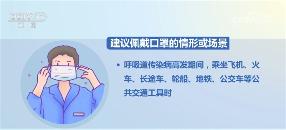 建議佩戴口罩的情形或場景包括:呼吸道傳染病高發(fā)期間,乘坐飛機(jī)、火車、長途車、輪船、地鐵、公交車等公共交通工具時(shí)。呼吸道傳染病高發(fā)期間,進(jìn)入超市、影劇院、客運(yùn)場站、廂式電梯等環(huán)境密閉、人員密集場所時(shí)。呼吸道傳染病高發(fā)期間,老年人、慢性基礎(chǔ)疾病患者、孕婦等前往室內(nèi)公共場所時(shí)。與出現(xiàn)呼吸道傳染病癥狀者共同學(xué)習(xí)、生活或工作期間。