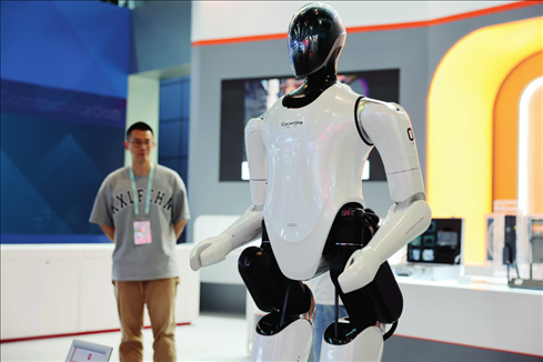 位于中關(guān)村國家自主創(chuàng)新示范區(qū)展示中心的一款全尺寸人形仿生機器人(2023 年 5 月 26 日攝)張晨霖攝 / 本刊