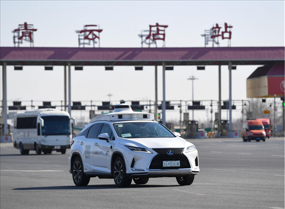 一輛自動(dòng)駕駛車行駛在北京大興國(guó)際機(jī)場(chǎng)到亦莊的自動(dòng)駕駛線路上(2024年3月1日攝)。新華社記者 鞠煥宗攝