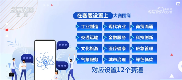 在賽題設置上,大賽圍繞工業(yè)制造、現(xiàn)代農業(yè)、商貿流通、交通運輸、金融服務、科技創(chuàng)新、文化旅游、醫(yī)療健康、應急管理、氣象服務、城市治理、綠色低碳12個行業(yè)及領域,對應設置12個賽道。