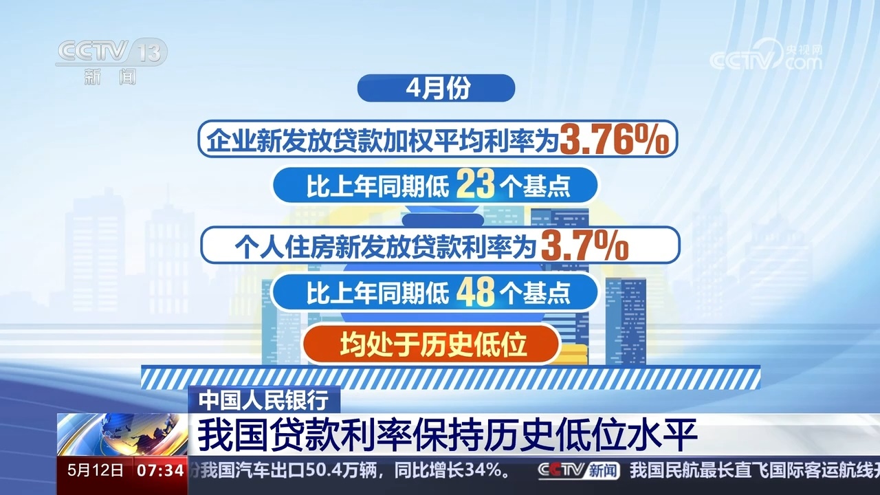 4月份企業(yè)新發(fā)放貸款加權(quán)平均利率為3.76%,比上年同期低23個基點;個人住房新發(fā)放貸款利率為3.7%,比上年同期低48個基點,均處于歷史低位。?