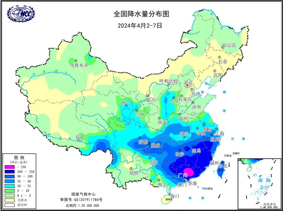 14次區(qū)域暴雨過(guò)程襲擊我國(guó),較常年同期明顯偏多。春季,我國(guó)共發(fā)生14次區(qū)域暴雨過(guò)程,較常年同期偏多3.8次。4月2-7日的暴雨過(guò)程為1961年以來(lái)同期第八強(qiáng),受其影響,我國(guó)華東南部、華中南部、華南東部及貴州東北部、重慶、四川中東部等地累計(jì)降水量50~100毫米,浙江西南部、福建、江西南部、湖南東南部、廣東大部等地累計(jì)降水量100~250毫米,局地超過(guò)250毫米(圖5);湖南茶陵(203.2毫米)、廣東始興(145.3毫米)日降水量超過(guò)極端閾值。