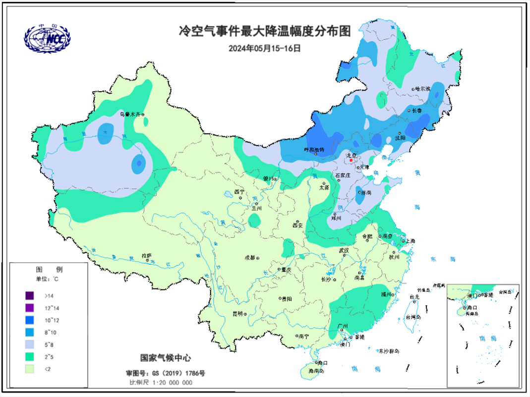 圖8 2024年5月15-16日全國(guó)最大降溫幅度分布圖