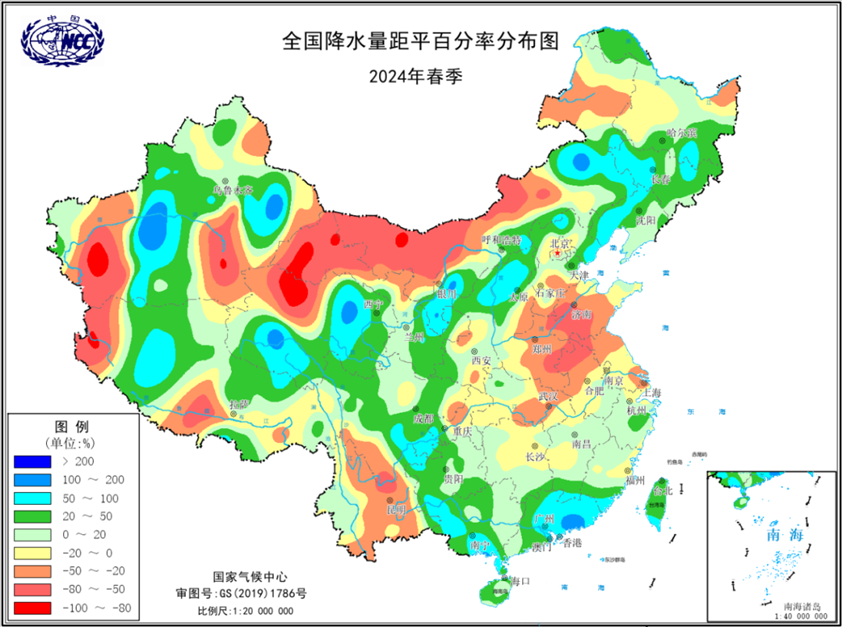 圖4 2024年春季全國(guó)降水量距平百分率分布圖(單位:%)