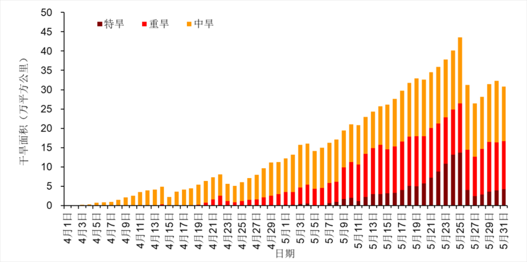 西南地區(qū)冬春連旱緩解,黃淮江淮干旱露頭發(fā)展。今年以來(lái)由于溫高雨少,我國(guó)西南地區(qū)出現(xiàn)冬春連旱,4月17日重旱及以上面積(32.6萬(wàn)平方公里)、特旱面積(13萬(wàn)平方公里)達(dá)到峰值。進(jìn)入5月后出現(xiàn)多次降水過(guò)程,冬春連旱緩解。4月以來(lái),黃淮、江淮等地氣象干旱開(kāi)始露頭并發(fā)展。至5月25日,中旱及以上等級(jí)干旱面積(43.6萬(wàn)平方公里)和特旱面積(13.7萬(wàn)平方公里)均達(dá)最大(圖6)。目前,黃淮中部、江淮北部、江漢東部等地仍存在中度及以上等級(jí)氣象干旱。5月31日,魯豫皖蘇鄂五省中旱以上干旱面積30.8萬(wàn)平方公里,其中重旱12.4萬(wàn)平方公里,特旱4.3萬(wàn)平方公里(圖7)。
