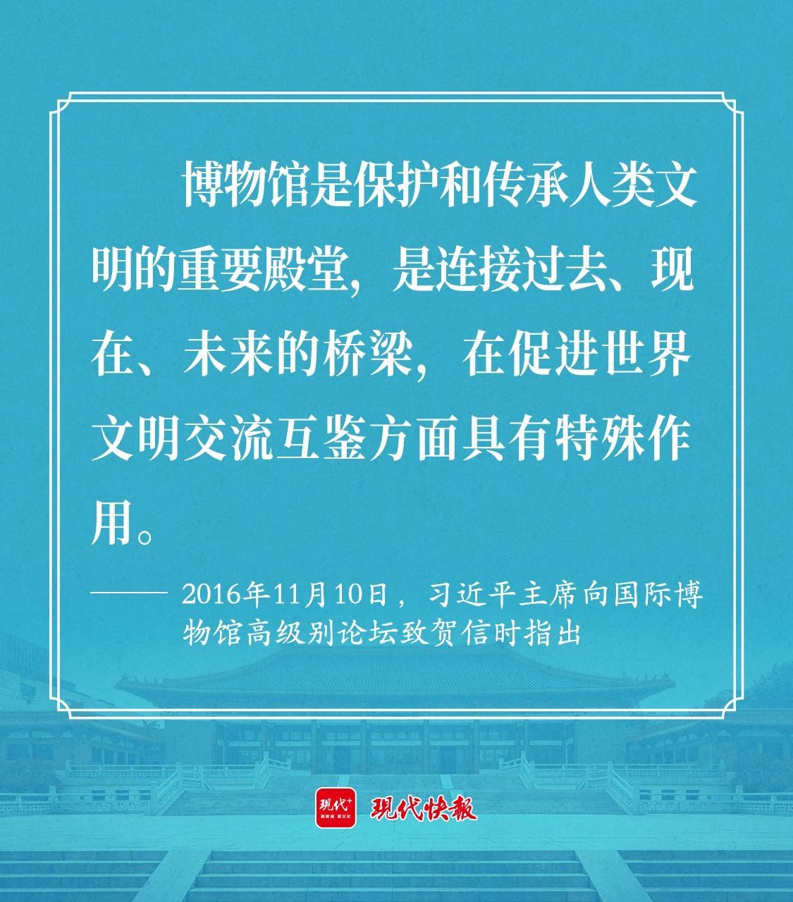 2016年11月10日,習(xí)近平主席向國際博物館高級別論壇致賀信時(shí)指出,博物館是保護(hù)和傳承人類文明的重要殿堂,是連接過去、現(xiàn)在、未來的橋梁,在促進(jìn)世界文明交流互鑒方面具有特殊作用。