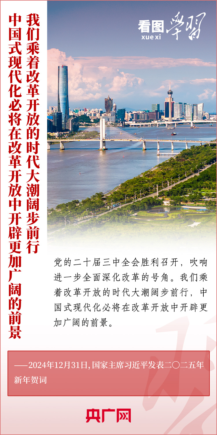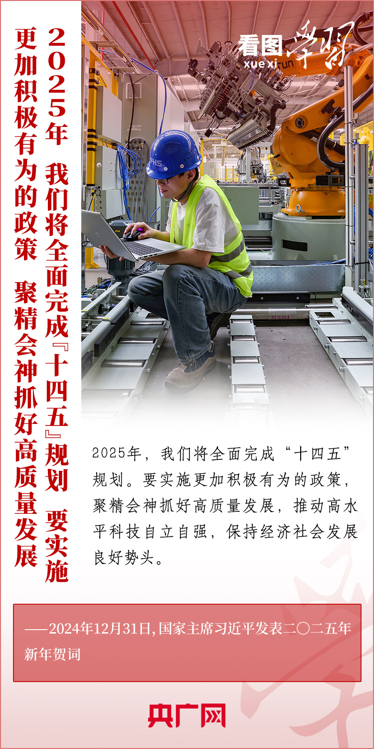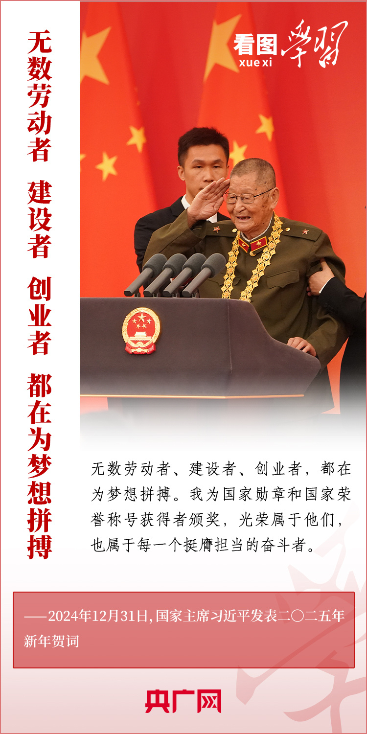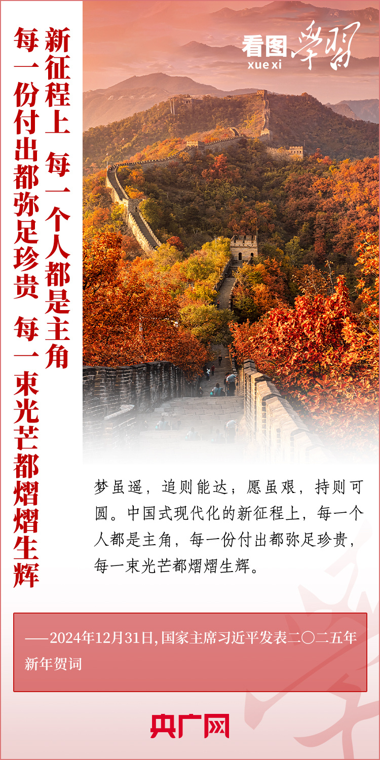“夢雖遙,追則能達;愿雖艱,持則可圓。”新年前夕,習(xí)近平主席發(fā)表二〇二五年新年賀詞。在溫暖有力的講述中,習(xí)主席深情回望過去一年中國不平凡的奮斗歷程、精彩瞬間,感慨大家一道經(jīng)歷的風(fēng)雨彩虹、難忘時刻,贊美無數(shù)為夢想拼搏的勞動者、建設(shè)者、創(chuàng)業(yè)者。習(xí)主席說,中國式現(xiàn)代化的新征程上,每一個人都是主角,每一份付出都彌足珍貴,每一束光芒都熠熠生輝。讓我們充滿信心,在新的一年接續(xù)奮斗!
