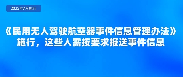 為規(guī)范民用無人駕駛航空器事件信息的管理,準(zhǔn)確掌握有關(guān)無人駕駛航空器安全運行信息,及時發(fā)現(xiàn)安全隱患,控制運行風(fēng)險,日前,民航局印發(fā)《民用無人駕駛航空器事件信息管理辦法》,自7月1日起施行。《辦法》要求,特定類和審定類合格證持有人、擁有中型和大型無人駕駛航空器50架(含)以上的開放類合格證持有人、擁有大型無人駕駛航空器10架(含)以上的開放類合格證持有人應(yīng)當(dāng)制定事件信息管理程序,指定滿足條件的人員負責(zé)事件信息管理,并按要求報送事件信息。事發(fā)相關(guān)單位和人員應(yīng)當(dāng)按照規(guī)定如實報告事件信息,不得瞞報、謊報或者遲報。