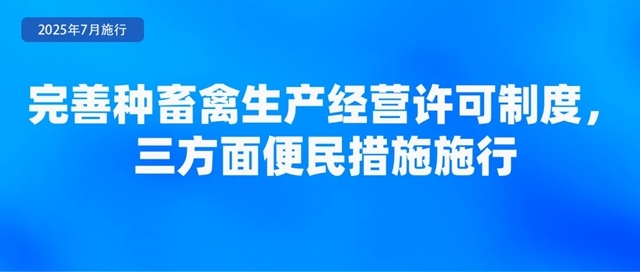 農(nóng)業(yè)農(nóng)村部公布了《種畜禽生產(chǎn)經(jīng)營許可管理辦法》,于2025年7月1日起實施?!掇k法》規(guī)定了三方面便民措施。一是統(tǒng)一平臺辦理。種畜禽生產(chǎn)經(jīng)營許可證的申請、受理、審核、核發(fā),統(tǒng)一在中國種業(yè)大數(shù)據(jù)平臺辦理,平臺提供查詢、核驗等功能,并與全國一體化在線政務(wù)服務(wù)平臺對接。二是統(tǒng)一有效期?!掇k法》將有效期統(tǒng)一確定為5年,并明確已取得的種畜禽生產(chǎn)經(jīng)營許可證有效期不變,到期后按照新規(guī)定辦理。三是簡化變更手續(xù)。對變更生產(chǎn)經(jīng)營者名稱、法定代表人(負責(zé)人)以及從事父母代種畜禽(含品種和配套系)和商品代仔畜、雛禽生產(chǎn)經(jīng)營,需要變更其生產(chǎn)經(jīng)營的畜禽品種的,向原發(fā)證機關(guān)提交變更申請表及證明材料,符合條件的,原發(fā)證機關(guān)在十五個工作日內(nèi)即予以變更。