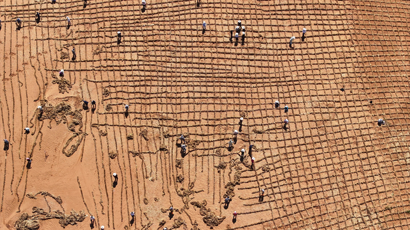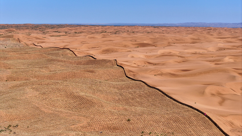 6月30日,在位于寧夏中衛(wèi)市長流水村的騰格里沙漠東南緣,隨著治沙工人將最后一列草方格穩(wěn)穩(wěn)扎下,這項跨越半個世紀的治沙工程,在騰格里沙漠寧夏境內實現(xiàn)全面“鎖定”。一條長153公里、最寬處達38公里的固沙鎖邊帶蜿蜒開來。