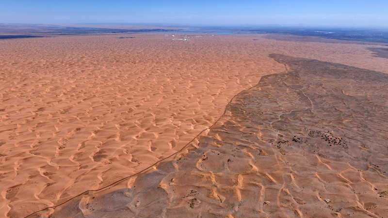 這是6月30日在寧夏中衛(wèi)市長流水村拍攝的騰格里沙漠東南緣治沙鎖邊工程現(xiàn)場(無人機照片)。
