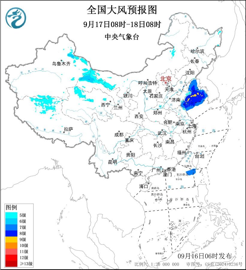 9月17日8時至18日8時,新疆東部、甘肅河西、青海北部、西藏北部等地部分地區(qū)有5級、陣風(fēng)6級的大風(fēng),其中,甘肅河西等地局地風(fēng)力可達(dá)7級、陣風(fēng)8級;黃海大部海域?qū)⒂?~8級、陣風(fēng)9級的大風(fēng),其中黃海中部的部分海域風(fēng)力可達(dá)9級、陣風(fēng)10級。