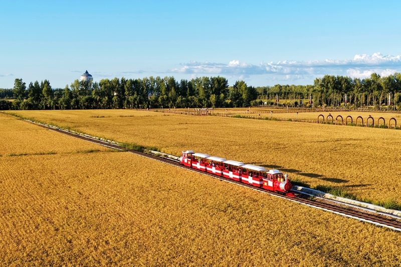 9月6日,在黑龍江省佳木斯市同江市,旅游小火車(chē)在稻田間行駛(無(wú)人機(jī)照片)。