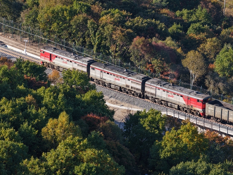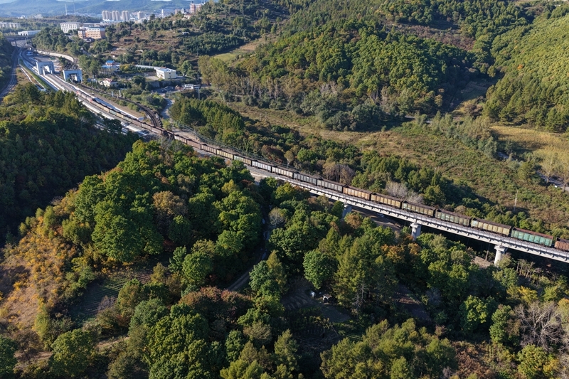 9月27日,滿(mǎn)載大宗品類(lèi)貨物的入境列車(chē)在濱綏鐵路綏芬河至國(guó)境線(xiàn)提質(zhì)改造工程新線(xiàn)路上行駛(無(wú)人機(jī)照片)。