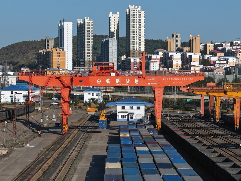 9月27日,滿(mǎn)載貨物的列車(chē)在綏芬河站北場(chǎng)進(jìn)行換裝作業(yè)(無(wú)人機(jī)照片)。