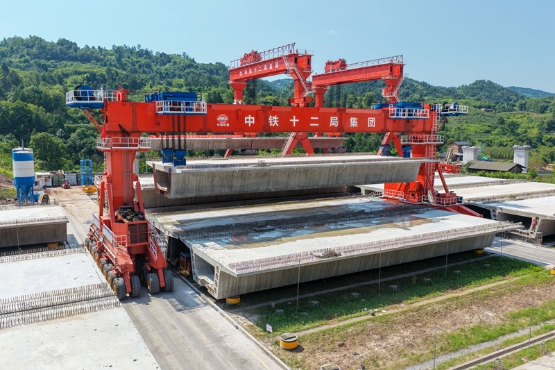 7月5日拍攝的渝萬高鐵江林村特大橋架梁施工作業(yè)現(xiàn)場(無人機照片)。