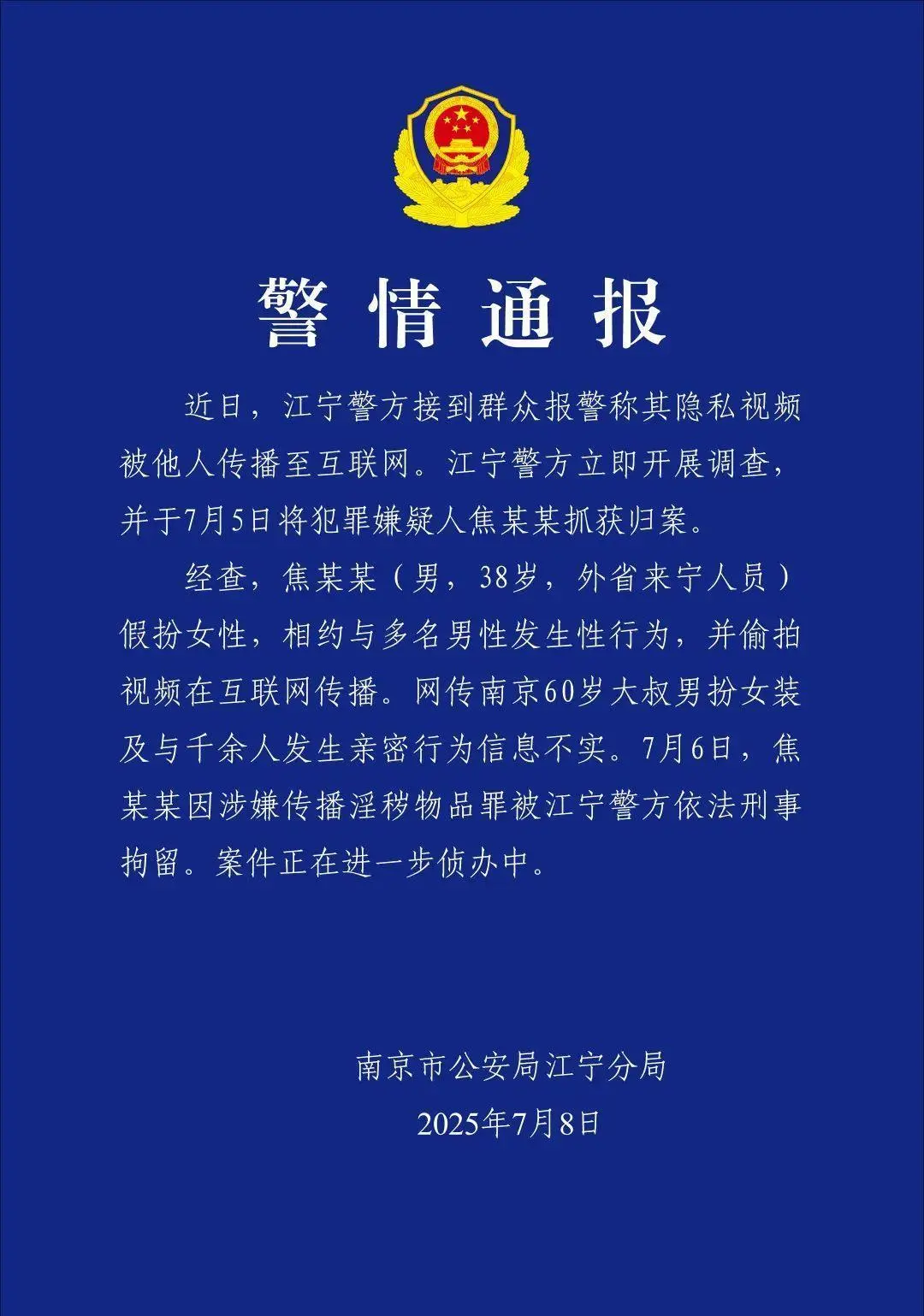 7月8日,南京江寧警方發(fā)布通報稱,焦某某(男,38歲,外省來寧人員)假扮女性,相約與多名男性發(fā)生性行為,并偷拍視頻在互聯(lián)網(wǎng)傳播。網(wǎng)傳南京60歲大叔男扮女裝及與千余人發(fā)生親密行為信息不實。目前,焦某某因涉嫌傳播淫穢物品罪被江寧警方依法刑事拘留。案件正在進(jìn)一步偵辦中。