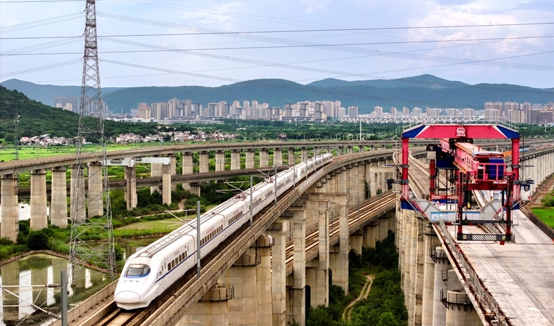 中鐵四局施工機(jī)械在巢馬城際鐵路最后一榀箱梁架設(shè)現(xiàn)場作業(yè)(7月8日攝,無人機(jī)照片)。