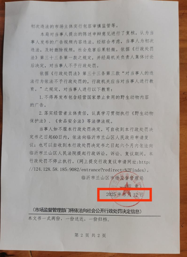 張女士向記者展示了上述《不予行政處罰決定書》,其中寫道,蘭山區(qū)市場監(jiān)督管理局認為當事人發(fā)布的廣告視頻內容違法,經綜合考慮,當事人初次違法,及時刪除視頻,社會危害后果輕微,依據《行政處罰法》第三十三條第一款之規(guī)定,經局機關負責人集體討論后決定,對當事人不予行政處罰。