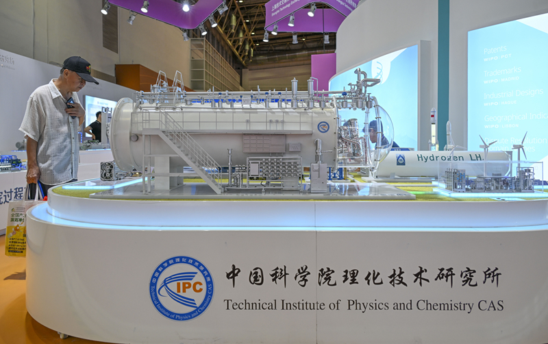 7月17日在先進制造鏈展區(qū)創(chuàng)新鏈專區(qū)拍攝的中國科學(xué)院理化技術(shù)研究所自主研制的國內(nèi)首套5噸/天氫液化器模型。