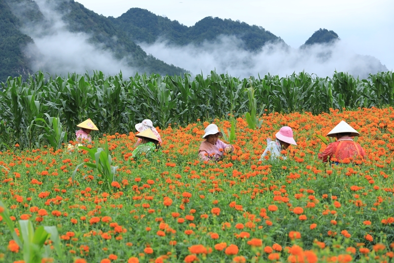 7月21日,云南騰沖市固東鎮(zhèn)農(nóng)民在鳳凰山采收萬壽菊。