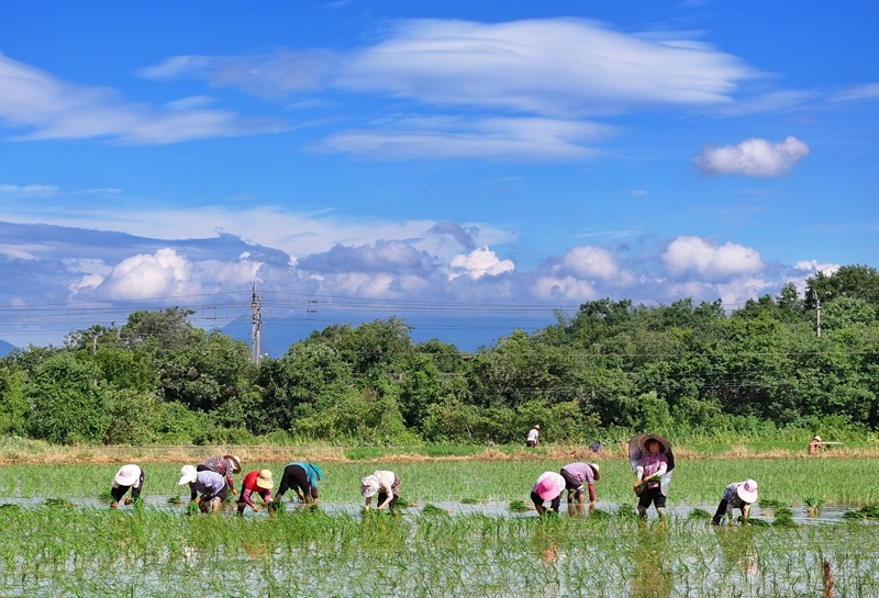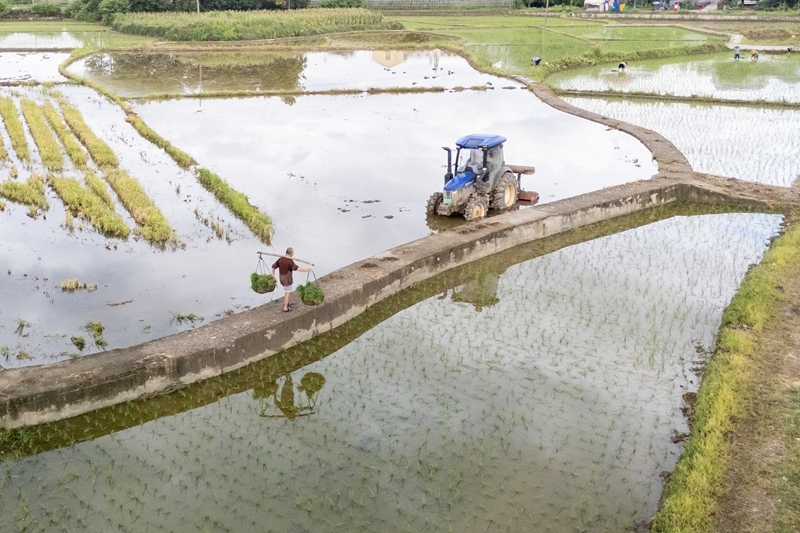 7月21日,農(nóng)民在湖南省婁底市雙峰縣荷葉鎮(zhèn)長塘村的田間插秧。