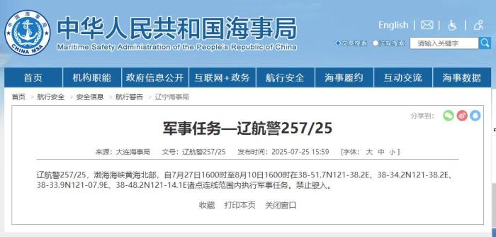 據(jù)中國海事局網(wǎng)站消息,大連海事局發(fā)布航行警告,7月27日16時至8月10日16時,渤海海峽黃海北部部分海域執(zhí)行軍事任務,禁止駛?cè)搿?/p>