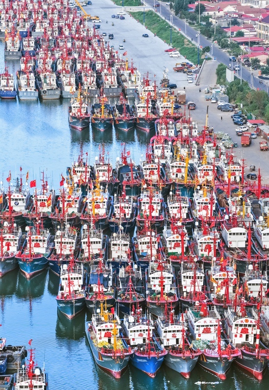 7月30日,漁船停泊在江蘇省連云港市贛榆區(qū)青口中心漁港,躲避臺(tái)風(fēng)(無(wú)人機(jī)照片)。