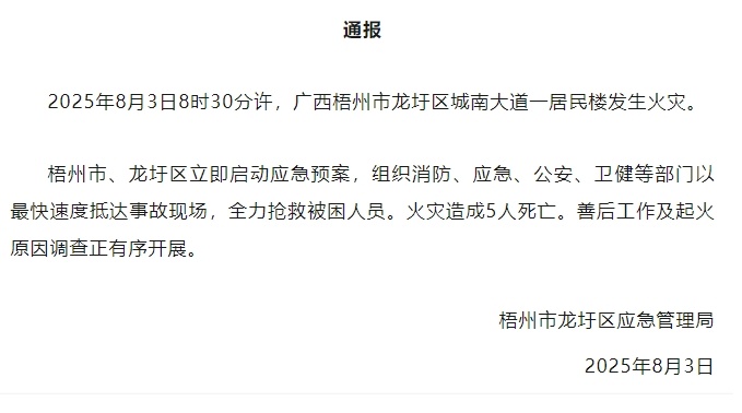 記者從廣西梧州市龍圩區(qū)應(yīng)急管理局了解到,8月3日8時30分許,梧州市龍圩區(qū)城南大道一居民樓發(fā)生火災(zāi)。梧州市、龍圩區(qū)啟動應(yīng)急預(yù)案,組織消防、應(yīng)急、公安、衛(wèi)健等部門抵達(dá)事故現(xiàn)場,搶救被困人員。火災(zāi)造成5人死亡。善后工作及起火原因調(diào)查正有序開展。