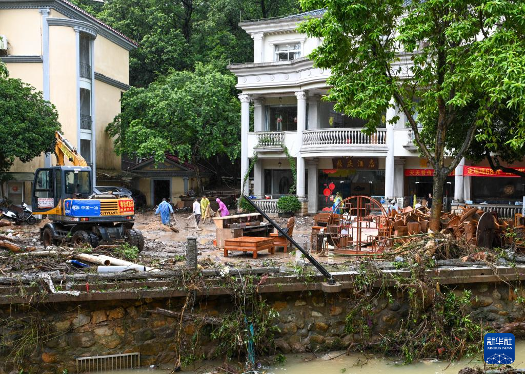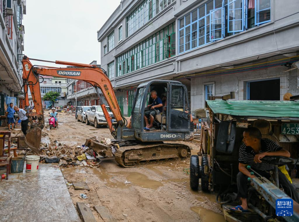 8月6日,在廣東清遠(yuǎn)佛岡縣石角鎮(zhèn)黃花村,工作人員用挖掘機(jī)將村民清理出的淤泥與雜物轉(zhuǎn)移到拖拉機(jī)上統(tǒng)一清運(yùn)。