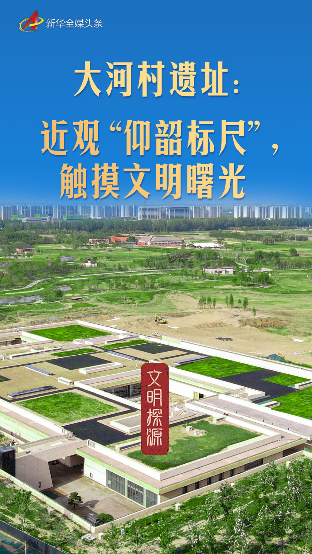 從空中俯瞰,這座設計上別出心裁的“下沉式”博物館,與綠意盎然的大河村國家考古遺址公園融為一體——泥土之下,黃河流域中華文明起源階段完整而連續(xù)的文化風貌層層疊壓。