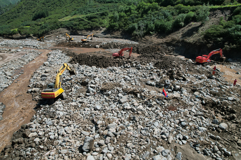 8月11日,在榆中縣馬坡鄉(xiāng)陽屲山村,中國安能救援隊使用挖掘機疏通清理山洪沖下的石頭(無人機照片)。