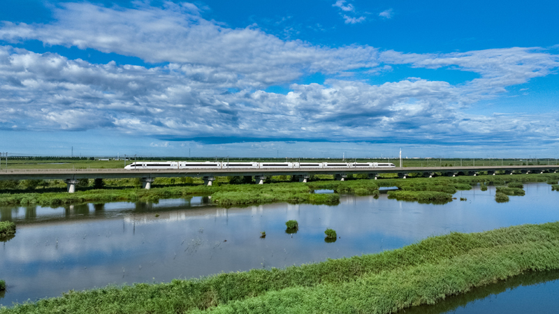 8月17日,復(fù)興號動車組列車行駛在哈齊高鐵線上(無人機(jī)照片)。