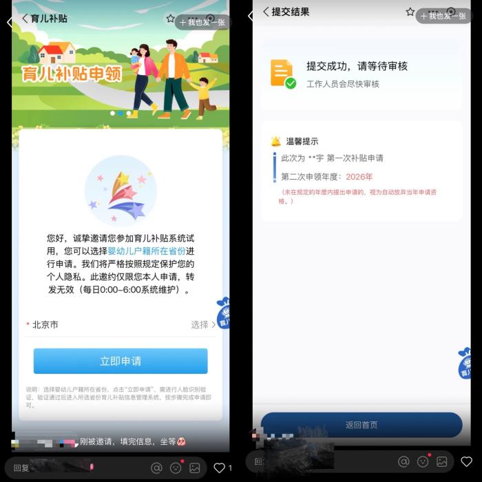 圖為微信(左)、支付寶(右)的“育兒補貼”小程序頁面
